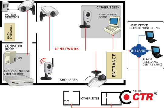 Schemat. Integracja kamer IP AXIS z systemami analitycznymi i POS w nowoczesnym obiekcie.
